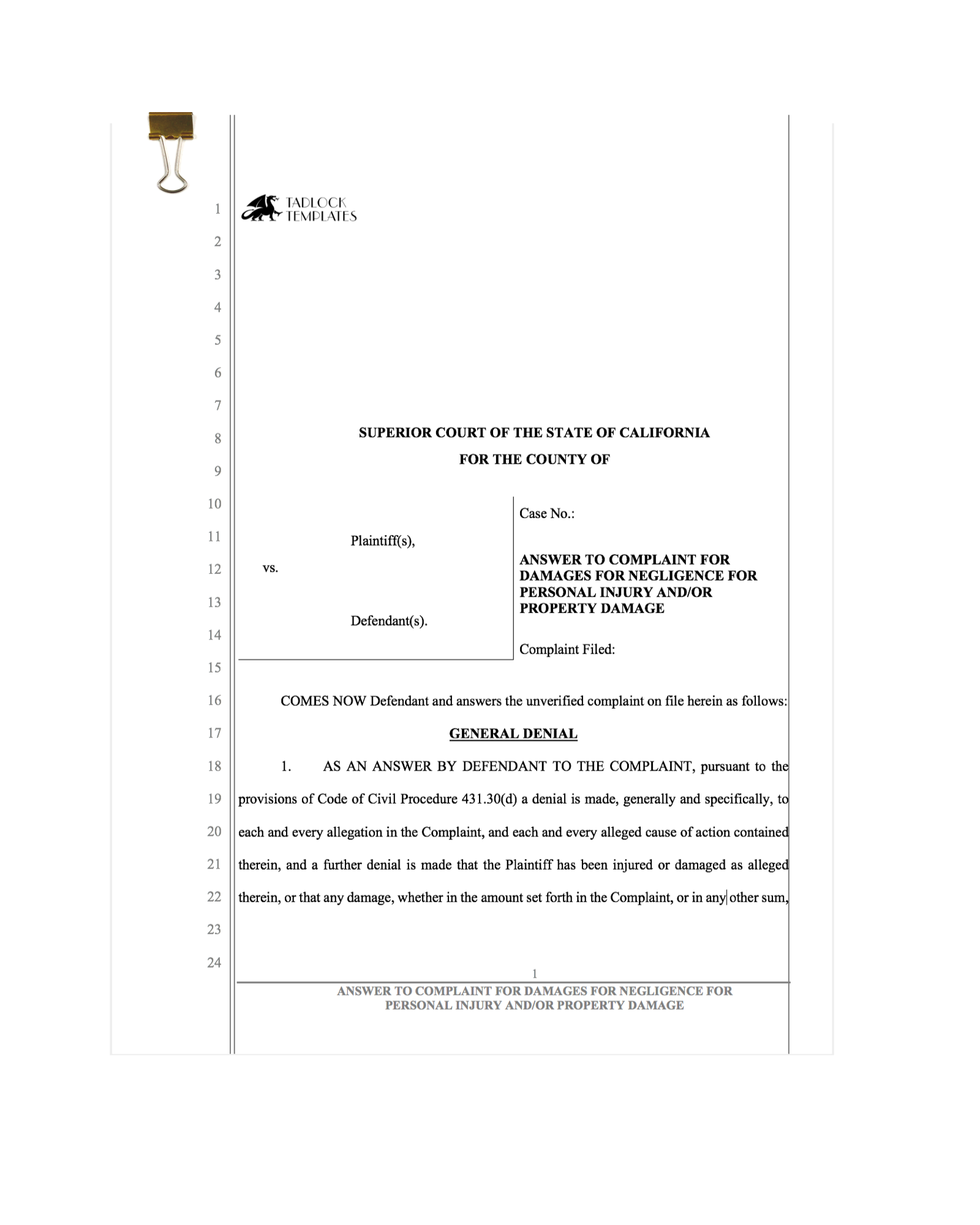 Unannotated copy; all 134 affirmative defenses, exclusive of the statutes and case law identifying, interpreting and applying the elements of the defense. 50 pages.